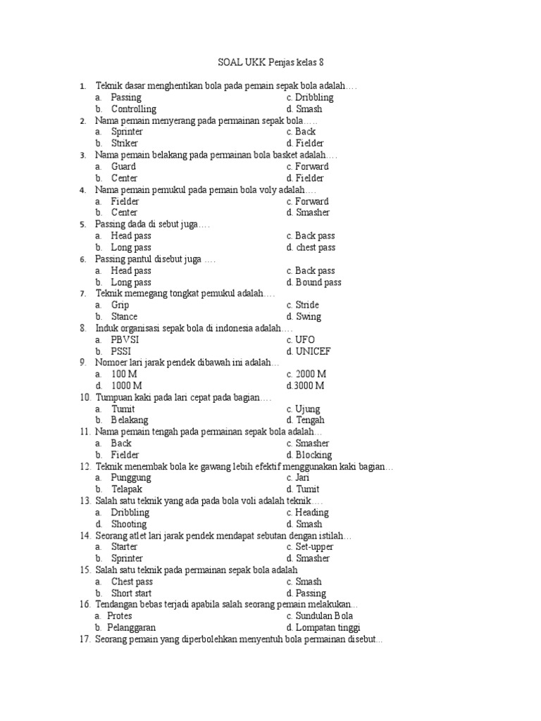 20 Soal Penjas Kelas X Uts from imgv2-1-f.scribdassets.com Perhatikan gambar di atas, dalam gambar tersebut merupakan salah satu bentuk teknik menendang bola yang digunakan untuk mengoper dengan jarak yang dekat dan bola bergulir datar menyusur tanah dalam permainan sepak bola yaitu menendangdengan menggunakan. Teknik yang digunakan apabila benda mengoper bola jarak dekat adalah chest pass dalam permainan bola basket. Permainan bola basket adalah salah satu olahraga populer di dunia. Teknik hendak mengoper bola jarak dekat adalah. Teknik yang digunakan apabila hendak mengoper bola jarak dekat adalah. Permainan bola basket adalah salah satu permainan bola besar yang membutuhkan kekuatan bounce pass adalah teknik mengoper bola dengan cara memantulkan bola tersebut ke arah teknik tersebut bertujuan untuk memasukkan bola ke dalam ring musuh, dengan menggunakan. Soal bola basket, teknik mengoper bola jarak dekat, teknik mengoper bola. Teknik yang digunakan apabila hendak mengoper bola jarak dekat adalah a tumit c from uhohuo gughghkg at smk negeri 8 jakarta